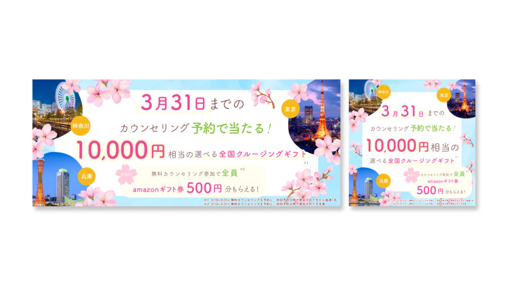 バナー作成 2025年7月27日 最終更新日時 : 2025年7月27日 Ayaka 【製作時間】3時間/1枚【使用ソフト】Photoshop・illustrator【担当業務】デザイン【意識した亊】春らしい季節感が伝わるデザインにしました。