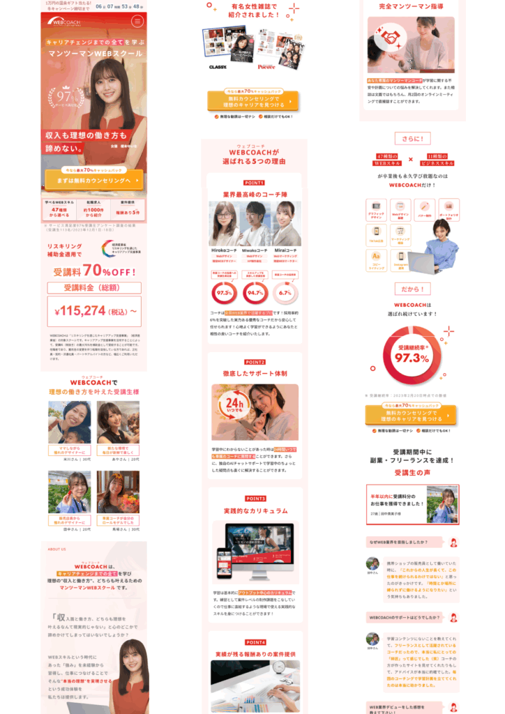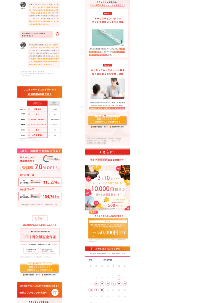 ランディングページ制作 2025年7月27日 最終更新日時 : 2025年7月27日 Ayaka 製作時間】20時間【使用ソフト】Photoshop・illustrator・Figma・HTML・CSS・jquery【担当業務】デザイン・実装【意識した亊】スクロール離脱を防ぐためjqueryで動きをつけたLPを作成しました。